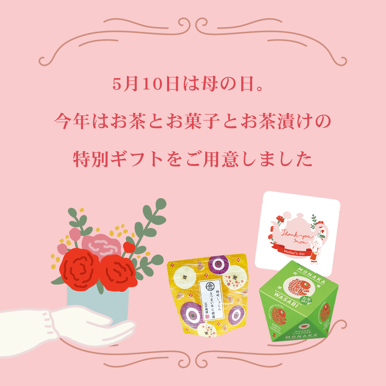 ティーバッグ5個入りパックはささら屋の6種類の緑茶から自由に選んでいただけますし、お茶漬け・クランチチョコも各3種類からお好きなものを自由に組み合わせられますので、お母さんの好みに合わせてカスタマイズも可能です♪