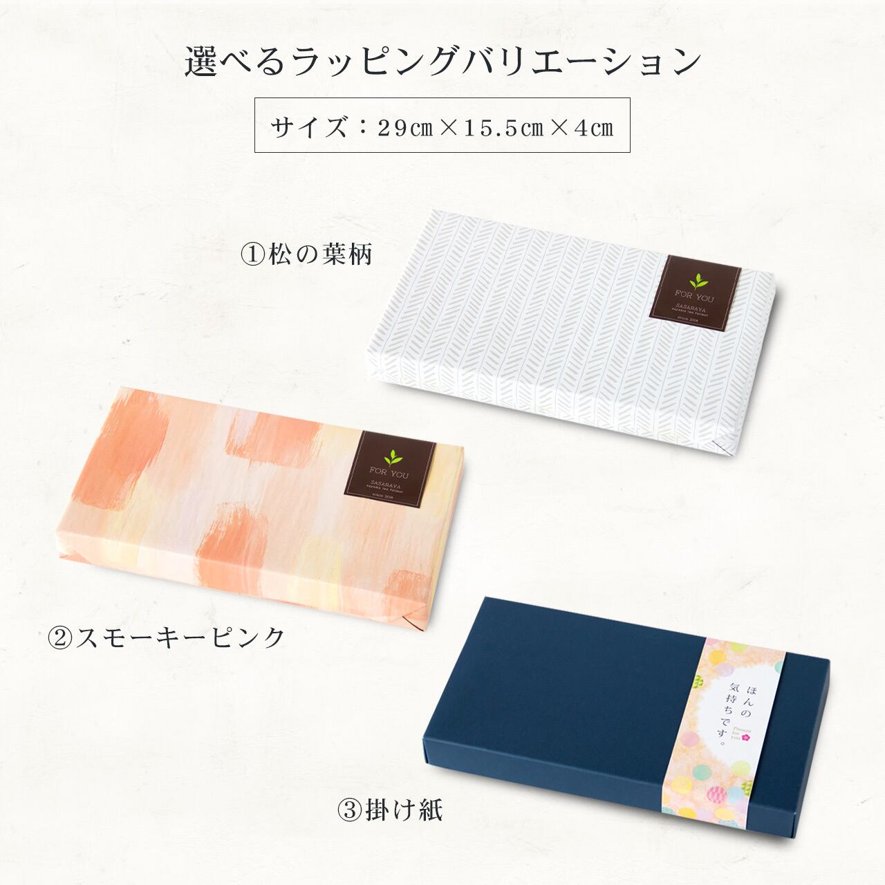 シックで上品な紺色のギフトボックスに掛け紙をすれば、ちょっとした手土産や内祝いなどにもぴったり。複数種の包装紙でのギフトラッピングや掛け紙にも対応しておりますので、ささら屋の本格的な狭山茶リーフを飲み比べて楽しめるギフト『ひるい』、ぜひ大切な方への贈り物にご利用ください。