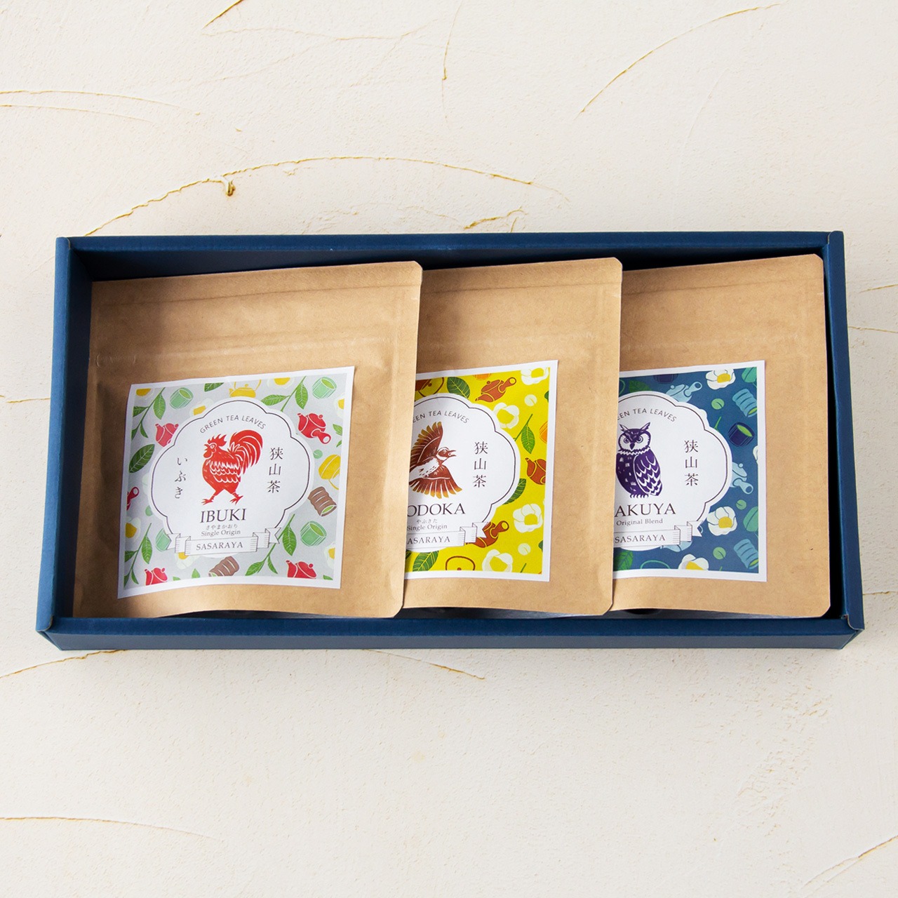 狭山茶農家 ささら屋が自信を持ってお届けする『いぶき』『のどか』『さくや』の3種類の上級煎茶リーフのギフトセットです。
