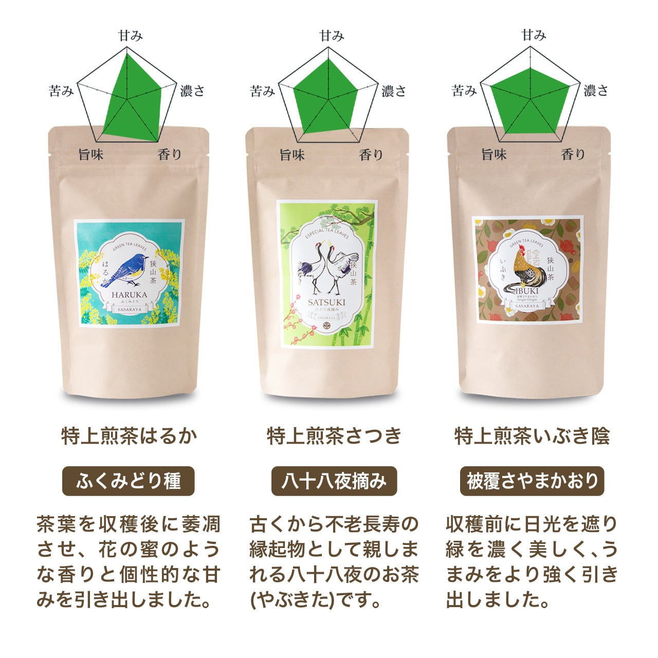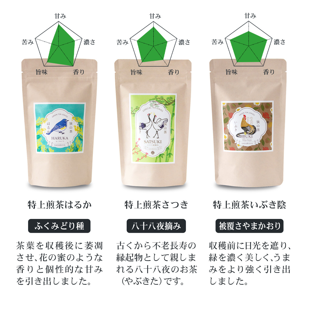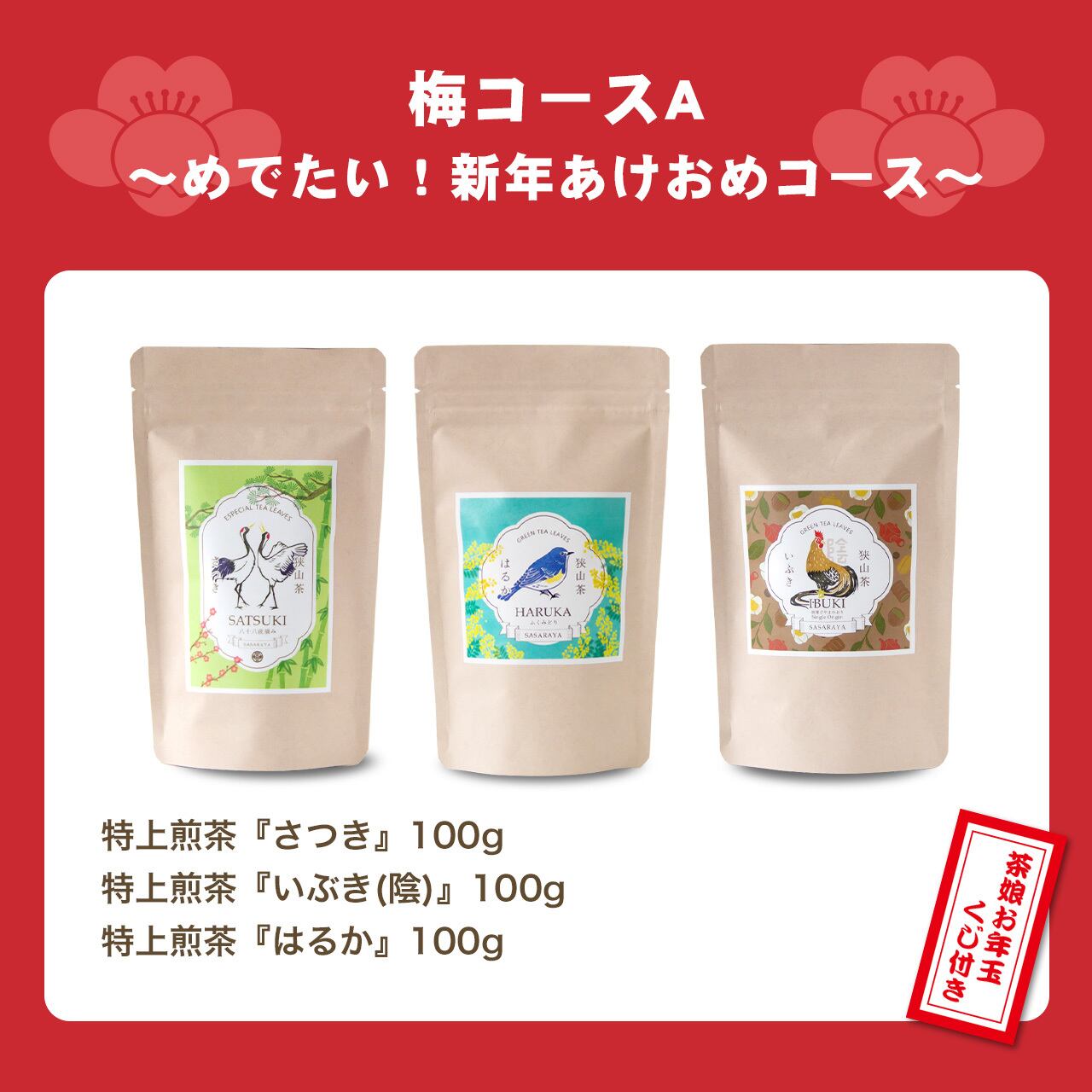こちらの『謹賀新年!あけおめコース』は、ささら屋の3種の特上煎茶をまとめたお得なセットです!