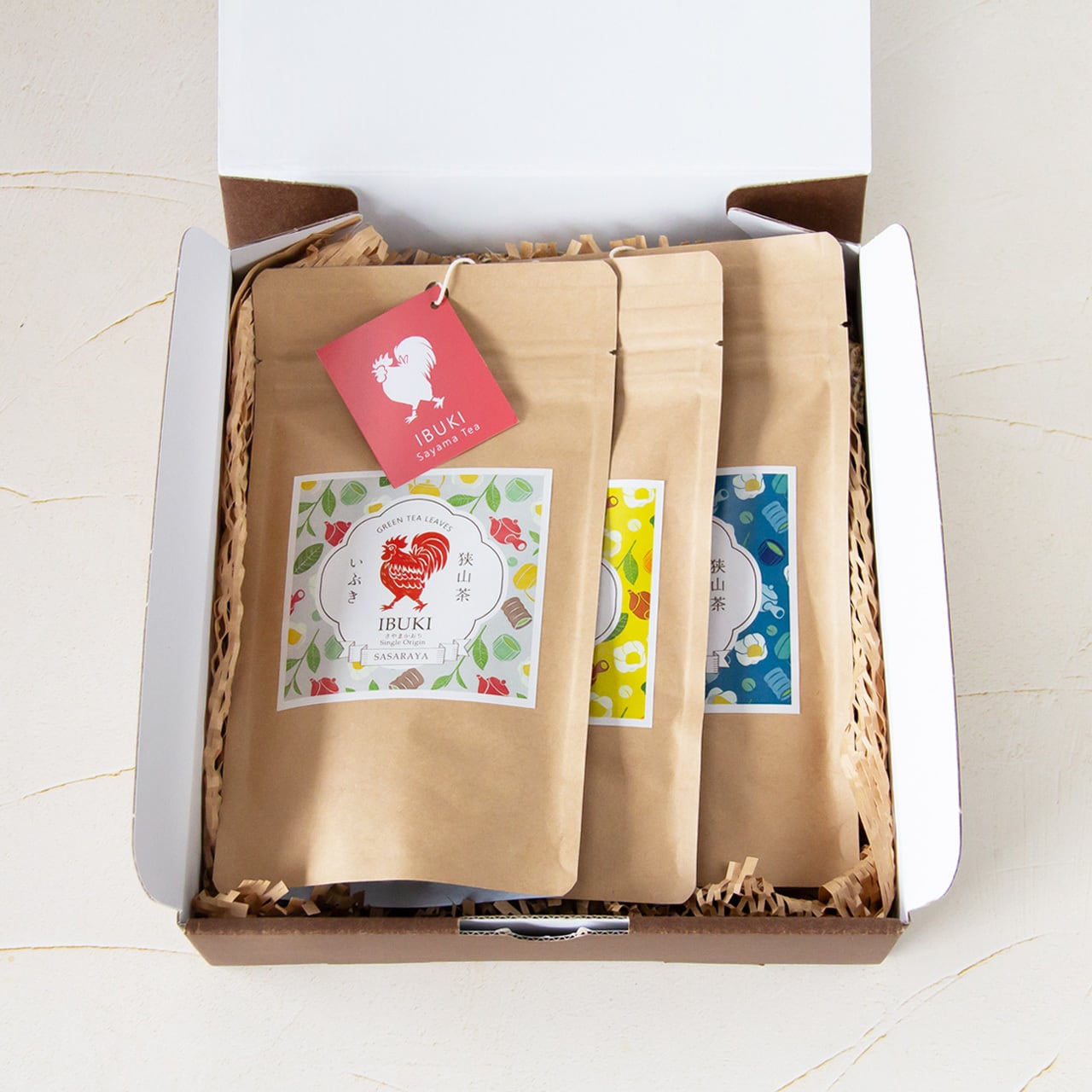 狭山茶農家 ささら屋が自信を持ってお届けする『いぶき』『のどか』『さくや』の3種類の上級煎茶リーフのギフトセットです。