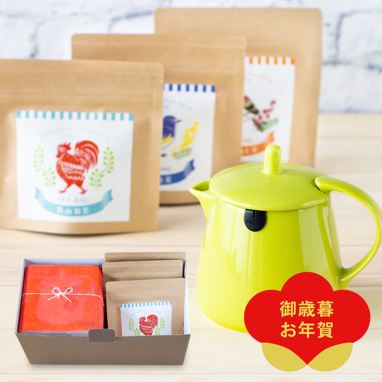 便利なティーバッグ用ポットと狭山茶農家 ささら屋の手掛ける上級・特上の煎茶5種類と狭山火入れ茶、和紅茶、ほうじ茶、ほうじ和紅茶といった全9種のティーバッグから2種類を組み合わせられるギフトパッケージです。