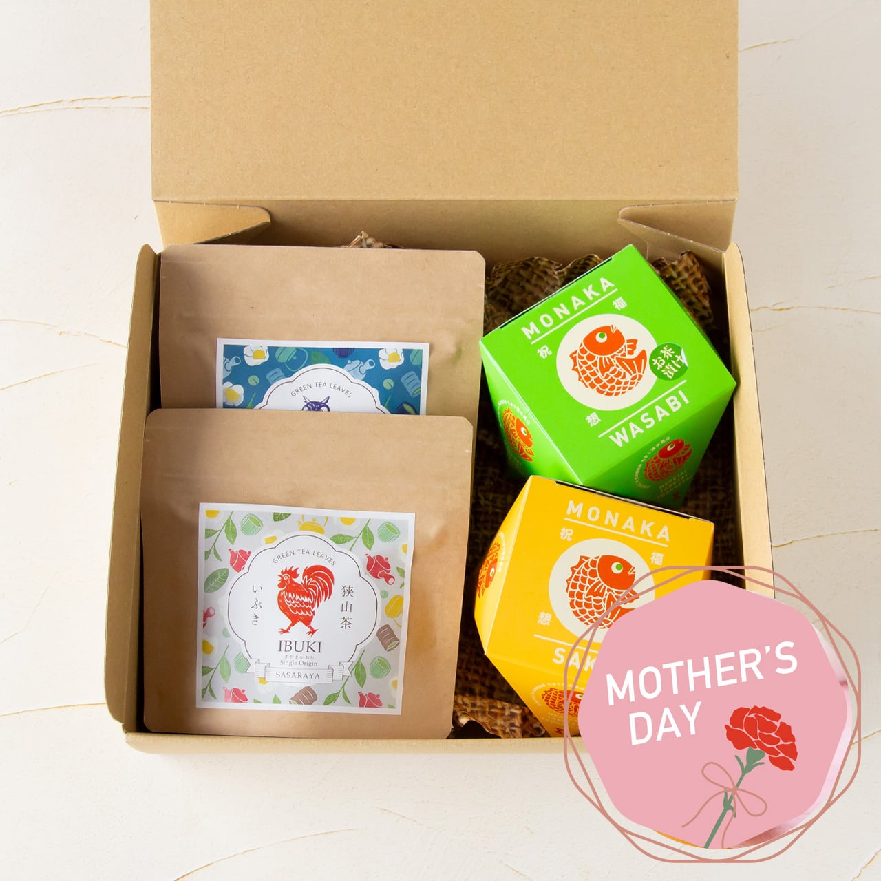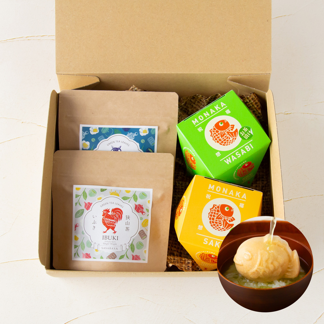 狭山茶農家 ささら屋のお届けする本格的な狭山茶と、鯛型もなかのお茶漬けがセットになったギフト商品です。