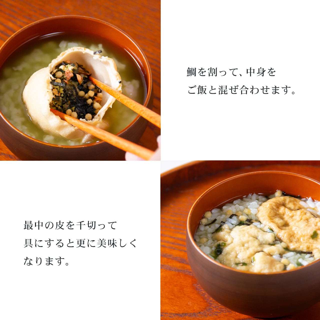 めでたい鯛型もなかのお茶漬けよろしく、皆さんのもとに吉兆を運んでほしいと願いを込めて命名しました。